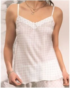 Le caraco Antigel de la collection Bijou du Jour offre confort et légèreté, parfait pour savourer les moments de détente. Ce top à fines bretelles réglables avec son petit nœud sur le devant est parfait pour matcher avec le pantalon de la collection Bijou du Jour.